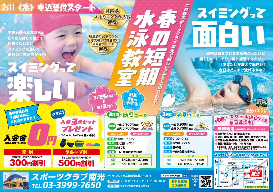 コース 日 程 時 間 学童1期 3/25(水)~27(金) 9:00~9:55 学童2期 4/1(水)~3(金) 9:00~9:55 - 割引&入会特典